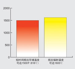 以上圖示為Fyrepel900系列隔熱服針對(duì)輻射熱和環(huán)境熱防護(hù)性能的相對(duì)比較。所顯示溫度值為試驗(yàn)室數(shù)據(jù)的推測(cè)數(shù)值,并不能用于代表此防護(hù)服裝實(shí)際使用于這些溫度環(huán)境中。使用者的具體身體狀況,工作環(huán)境,以及實(shí)際工作性質(zhì)都會(huì)對(duì)防護(hù)溫度及暴露時(shí)間產(chǎn)生不確定性。
